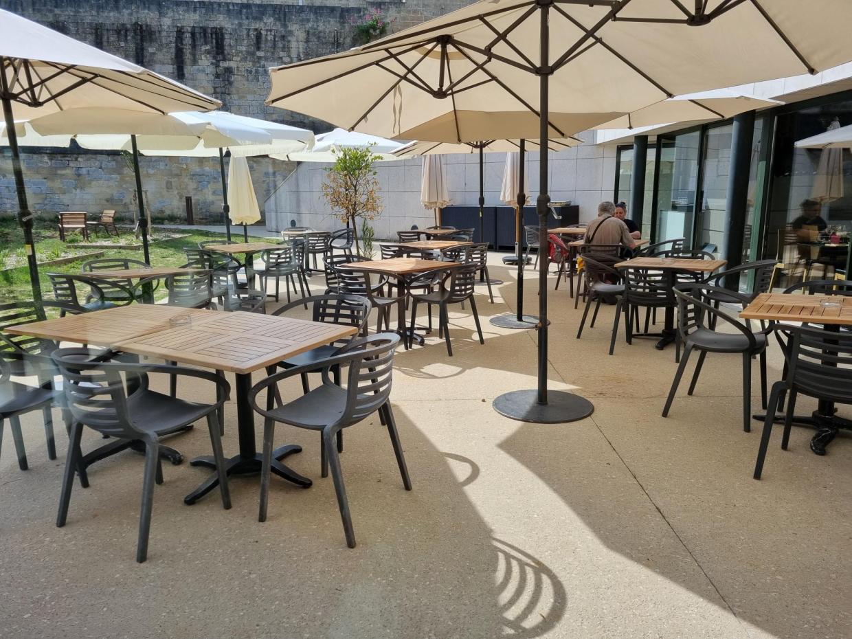 Terrasse panoramique ensoleillée située face aux remparts et au ravissant "Jardin des statues".